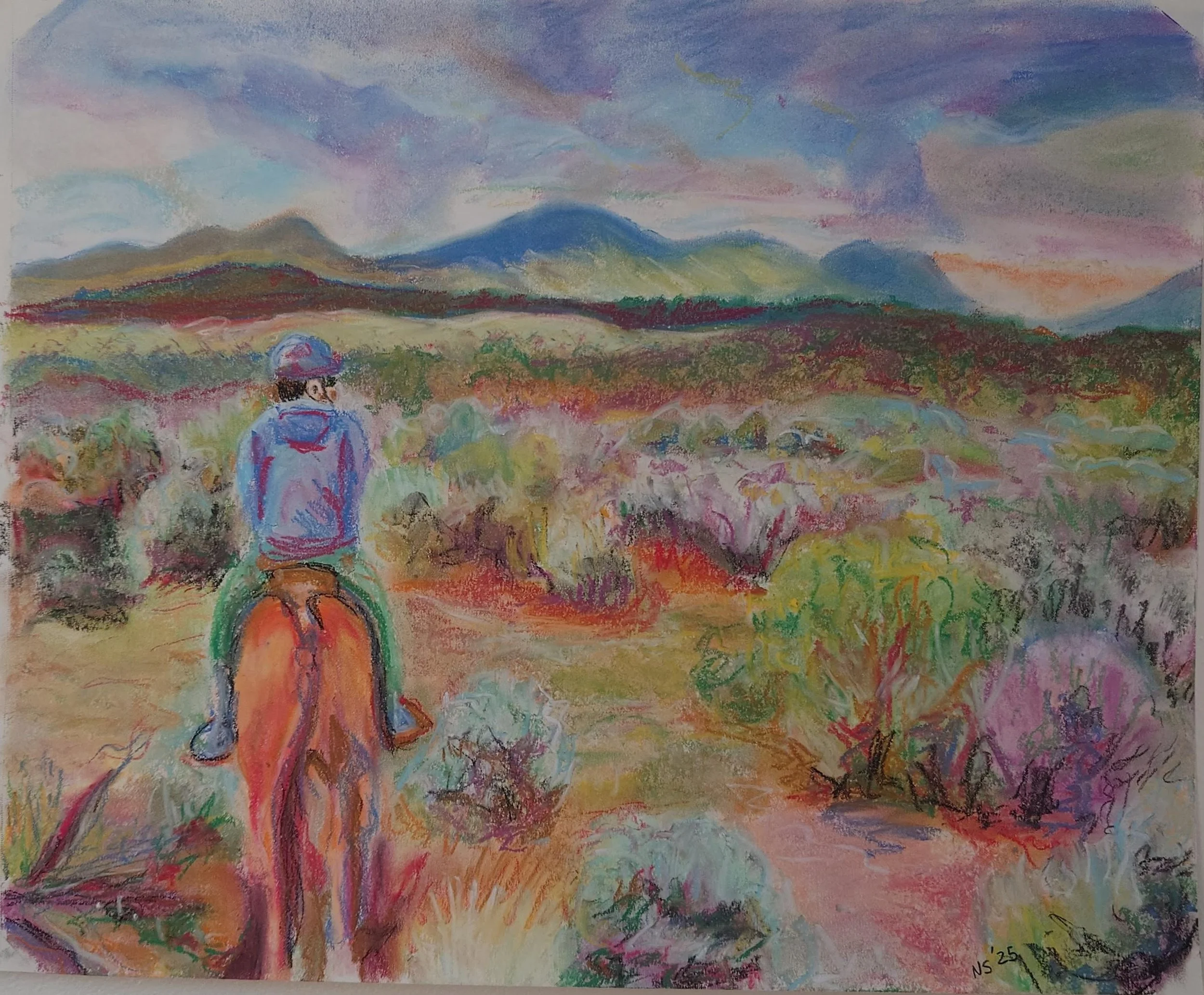 Golden hour ride. Taos, NM. Pastel on paper. 2025.