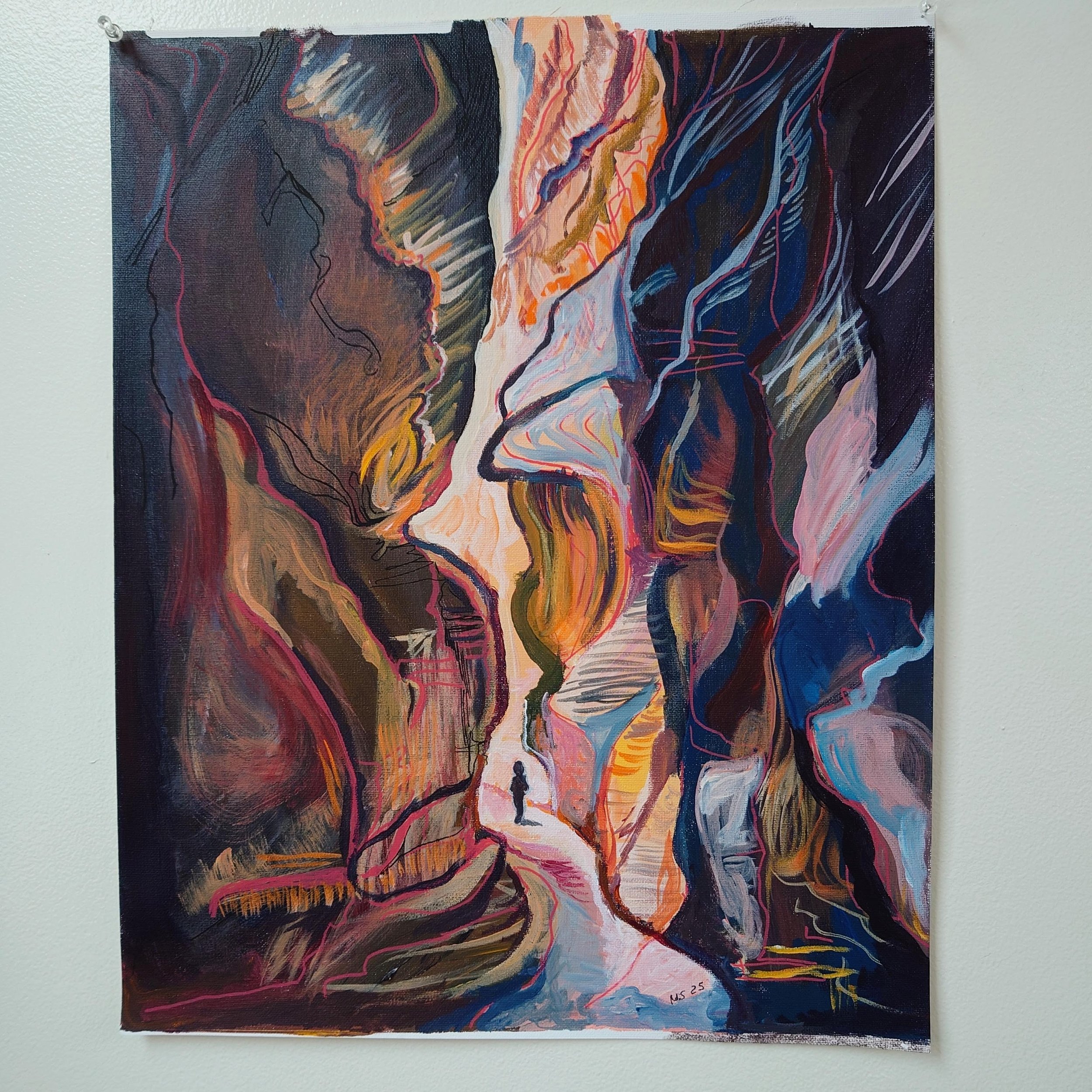 Narrow place. Inspired by Al Siq canyon on the way to Petra and Passover coming. Acrylic on canvas. 2025.