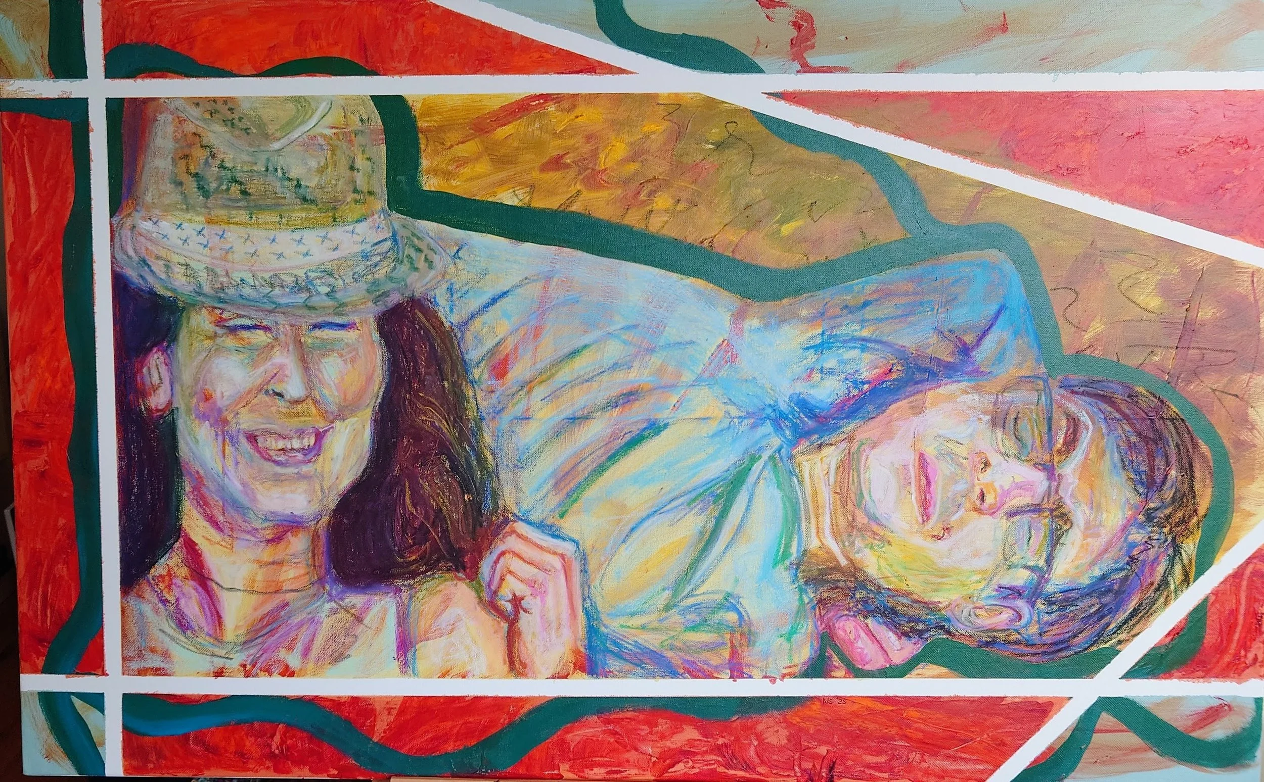 Summer love. Wall paint, acrylic, and oil pastel on large stretched canvas. 2025.