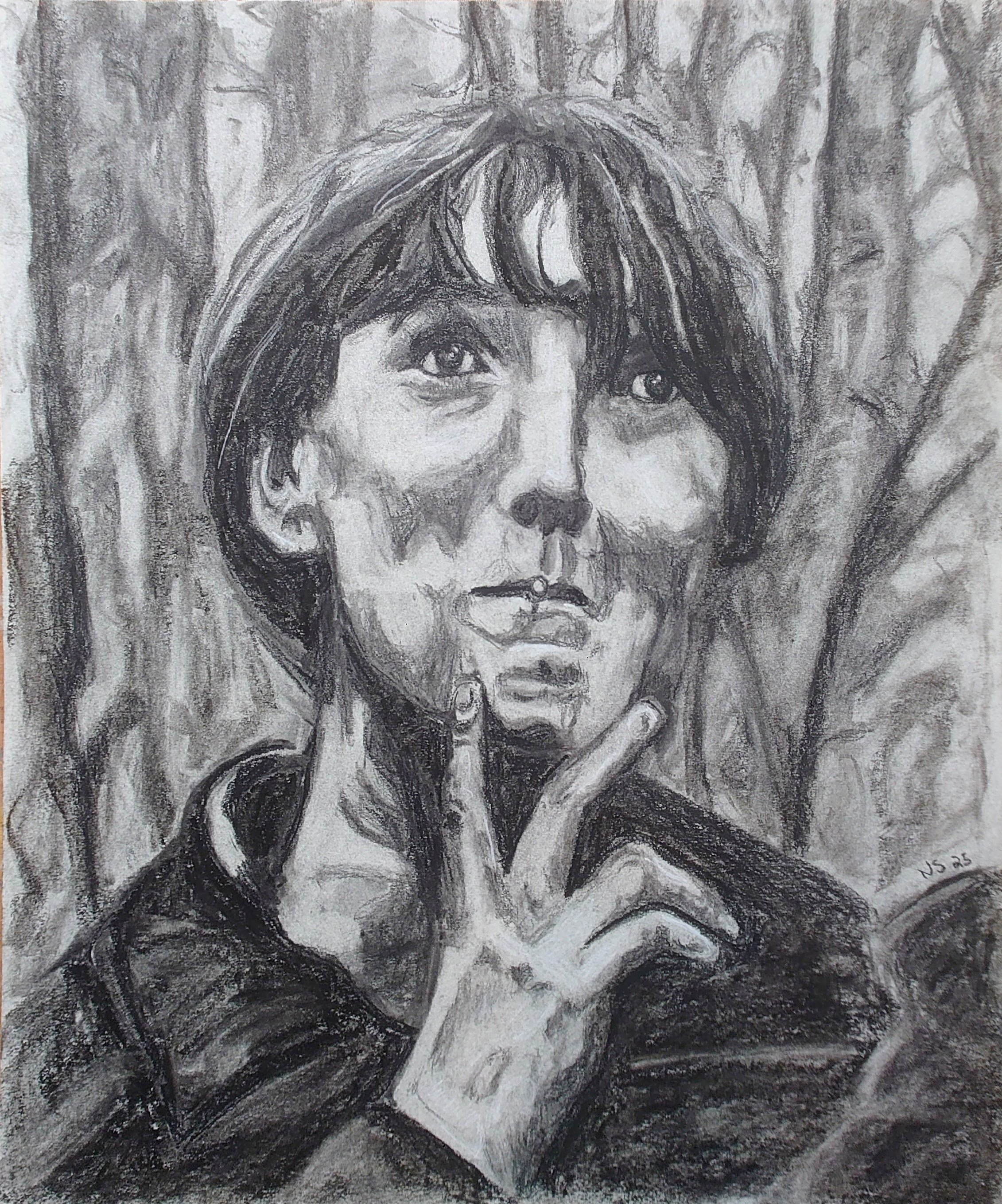 Tracy. Charcoal on paper. In honor of a lost friend. I didn't know her at this age, but I would like to think she'd find me drawing this humorous. 2025.